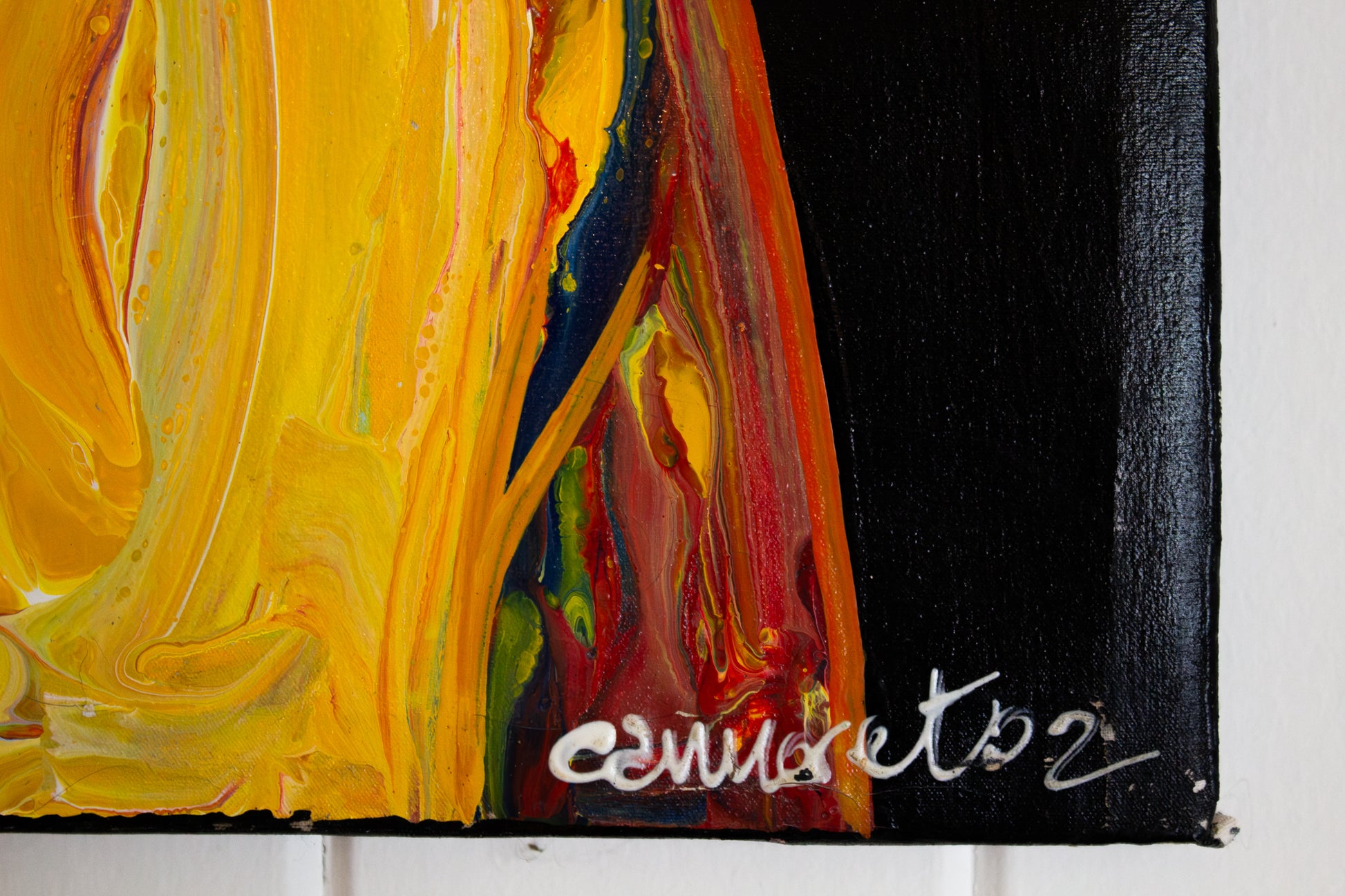 This piece has a slight defect. The piece was tightly bound during shipping, and part of the paint cracked. It has been repaired by glueing and hard-pressing the canvas to an extra piece of frame. Up close, this crack is slightly perceptible. From afar, it's completely imperceptible. This piece will be difficult to remove from the frame, due to the glue.